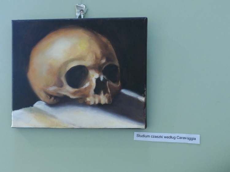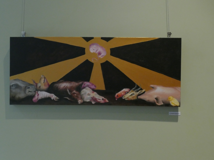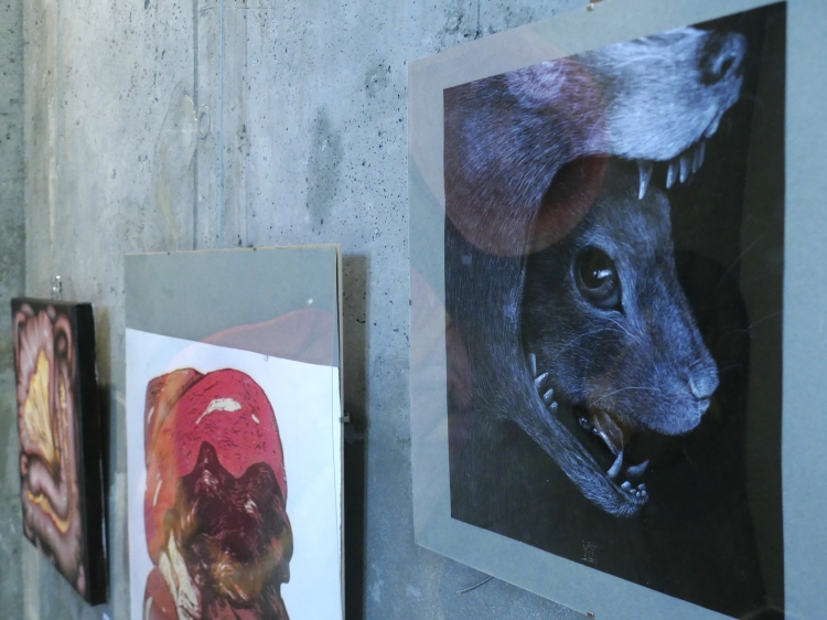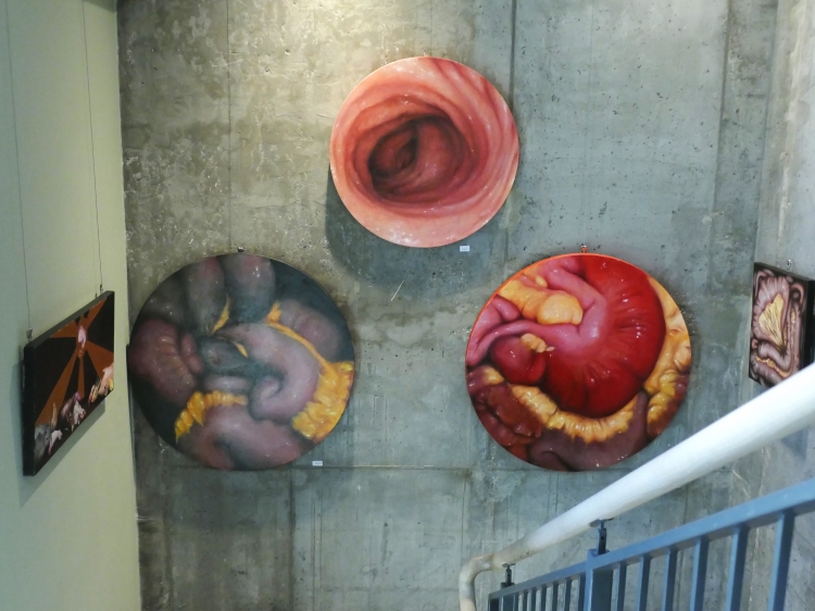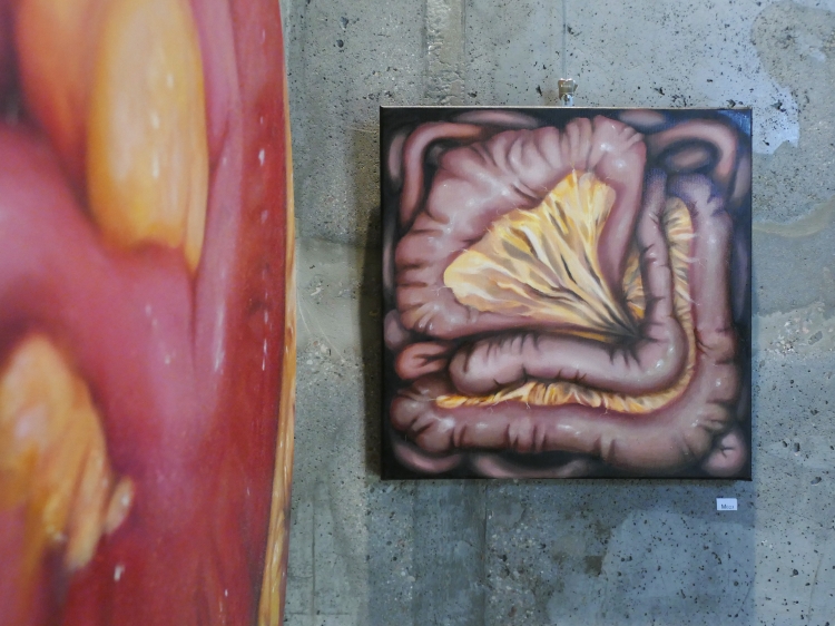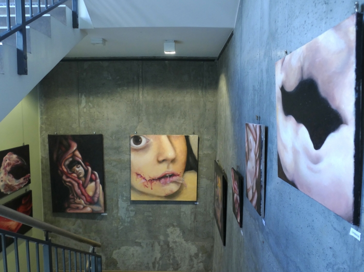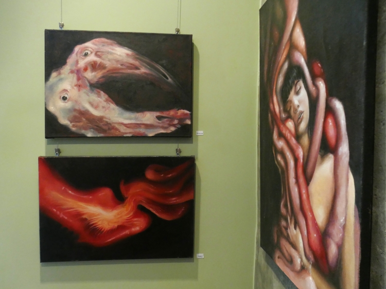 Wystawa „Droga w mrok” jest prezentacją ścieżki mojej edukacji na Akademii Sztuk Pięknych oraz tego, w jaki sposób szukałam swojego miejsca w świecie sztuki i malarstwa. Począwszy od trzeciego roku studiów wiedziałam, że moja twórczość poświęcona będzie człowiekowi i jego wewnętrznym rozterkom oraz szeroko pojętemu cierpieniu. Od zawsze interesowałam się ludzką psychiką, zaburzeniami psychicznymi i uczuciami z nimi związanymi. Żaden ze sposobów na opis odczuwanych wówczas emocji, stresu, lęku i braku chęci do dalszego życia moim zdaniem nie jest w stanie oddać ich prawdziwej istoty. Wybrałam więc język malarstwa. Dalszą drogą była analiza ludzkiego wnętrza w sposób dosłowny oraz nie dosłowny. Szczególnie zaintrygowały mnie jelita i związane z nimi emocje i odczucia oraz to, jak wpływają na nasze zdrowie psychiczne. Są odpychające zamieniając piękne, pachnące, dające energię pożywienie w odrażający produkt uboczny procesu przemiany materii. Ta myśl prześladowała mnie od dawna, w momencie gdy przelałam ją na płótno stała się moim sprzymierzeńcem. Moja droga się nie skończyła. Śmiem twierdzić, że jestem na jej początku. Mojej osobistej drogi w mrok, która nie przestaje mnie zaskakiwać.